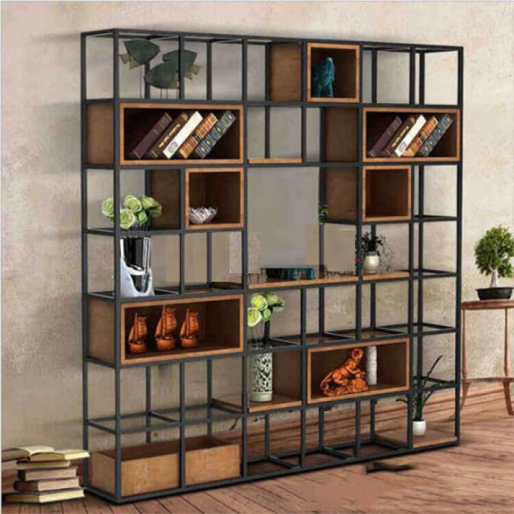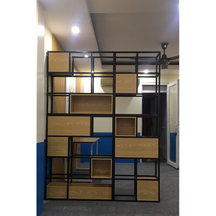 Kệ trang trí khung sắt làm vách ngăn là dòng sản phẩm kệ sắt trang trí kiêm kệ để sách, với thiết kế đơn giản, tinh tế và lôi cuốn. Được kết hợp giữa hai chất liệu chủ đạo là gỗ và khung sắt, giúp bạn không phải tốn quá nhiều thời gian, công sức và chi phí để trang trí lại căn phòng của mình. Mẫu thiết kế là sự kết hợp giữa các tấm gỗ MDF dày 17mm và những khung sắt được sắp xếp với nhau một cách hài hòa và bắt mắt người nhìn. Kệ gỗ khung sắt có khả năng tạo điểm nhấn ấn tượng cho căn phòng.